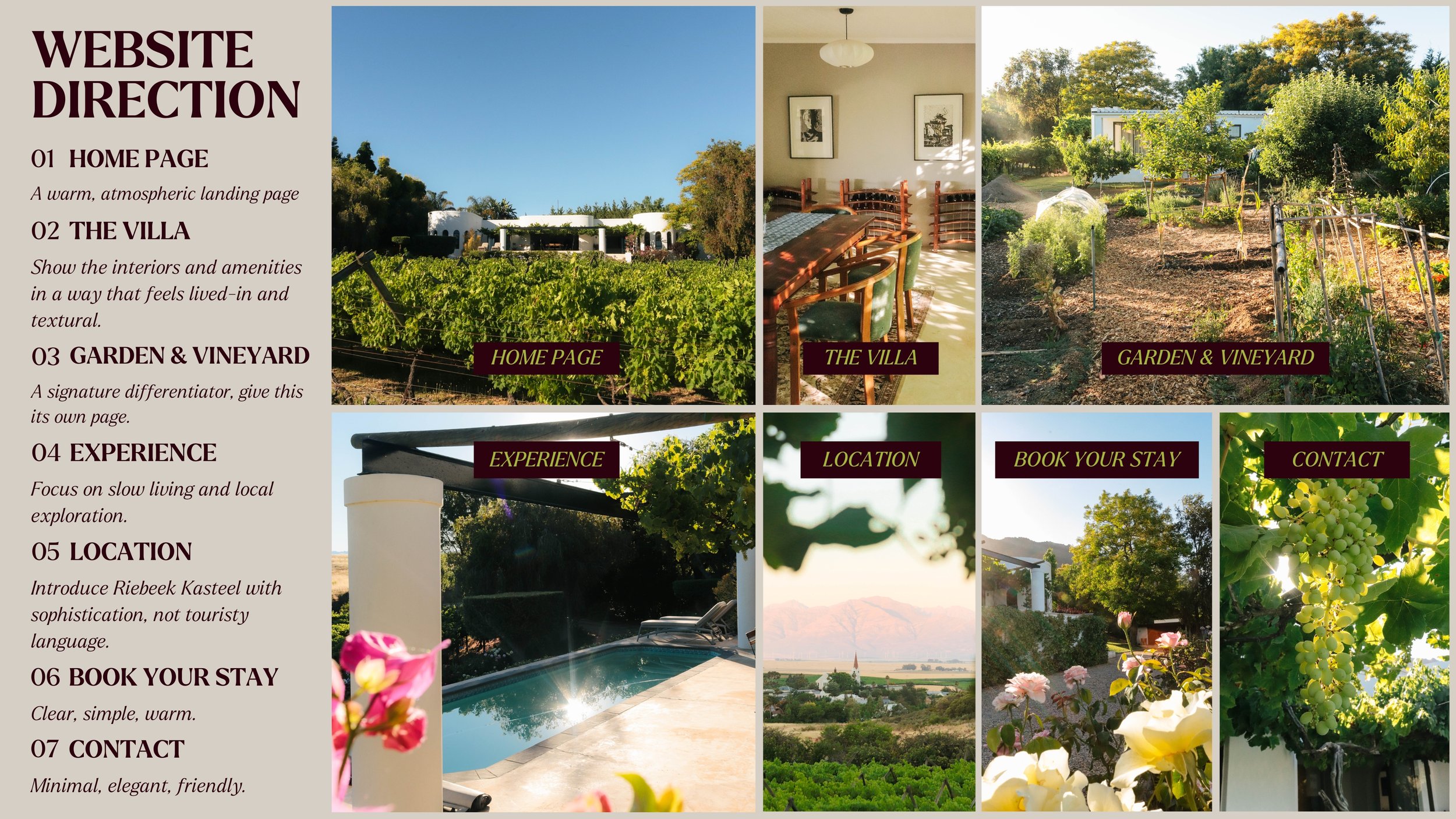 I was brought on board for a once off project to translate the founders’ vision into a compelling, cohesive website. From developing the visual identity for the website to launching the full site, every detail was crafted to evoke the villa’s warm, grounded charm.